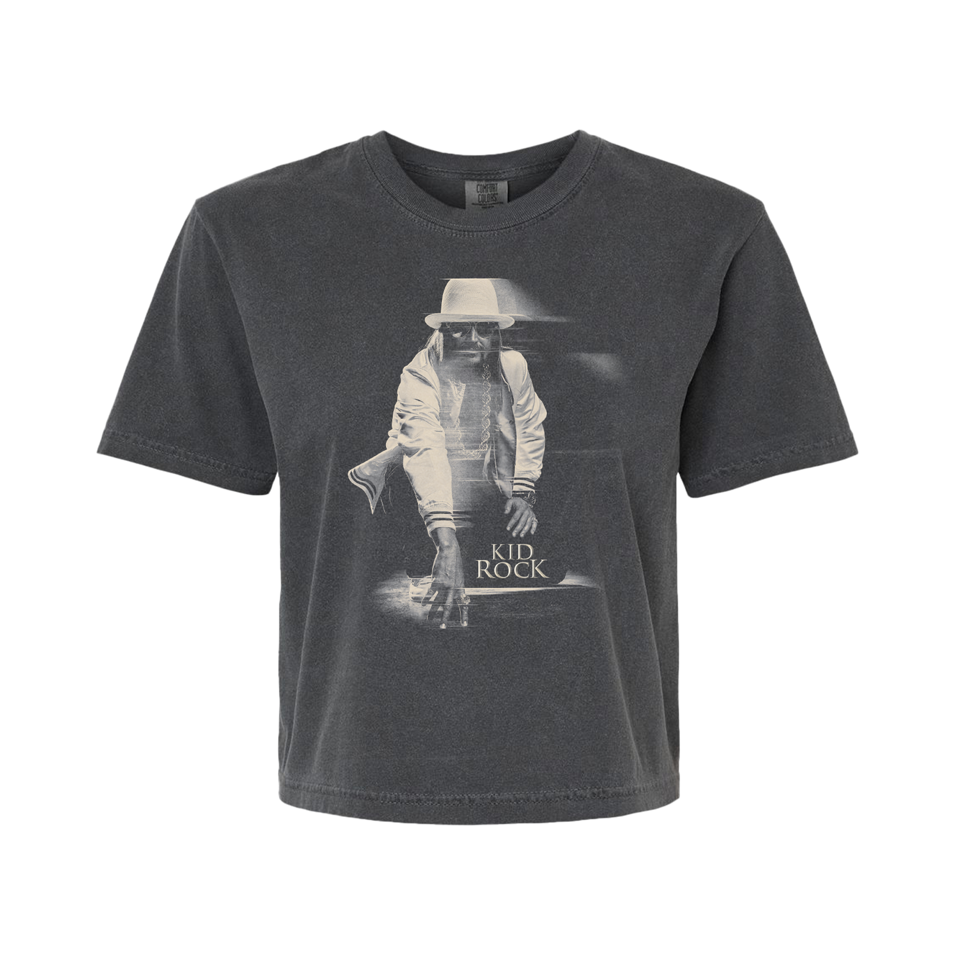 "In The Shadows" design printed on a 100% cotton grey crop top.