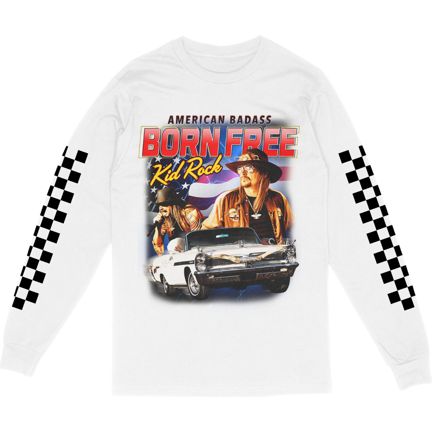 "American Badass, Born Free" design, screen printed on a 100% cotton white long sleeve t-shirt.